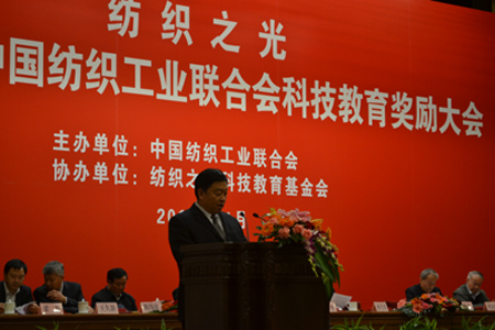 2012年11月29日,“紡織之光”2012年度中國(guó)紡織工業(yè)聯(lián)合會(huì)科技教育獎(jiǎng)勵(lì)大會(huì)在北京人民大會(huì)堂舉行。本次獎(jiǎng)勵(lì)大會(huì)共有受獎(jiǎng)勵(lì)項(xiàng)目171項(xiàng),其中13項(xiàng)成果榮獲科技進(jìn)步一等獎(jiǎng)。集團(tuán)公司項(xiàng)目“筒子紗數(shù)字化自動(dòng)染色成套技術(shù)與裝備”榮獲紡織工業(yè)聯(lián)合會(huì)科技進(jìn)步一等獎(jiǎng)。董事長(zhǎng)陳隊(duì)范上臺(tái)領(lǐng)獎(jiǎng)并作為受獎(jiǎng)企業(yè)唯一代表發(fā)言。王天凱會(huì)長(zhǎng)等協(xié)會(huì)領(lǐng)導(dǎo)對(duì)康平納數(shù)十年來(lái)產(chǎn)業(yè)結(jié)構(gòu)的調(diào)整予以充分肯定,高度評(píng)價(jià)了康平納項(xiàng)目對(duì)推動(dòng)紡織行業(yè)進(jìn)步的巨大作用。