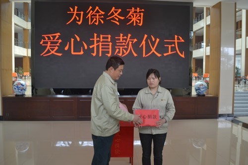 當(dāng)接過公司領(lǐng)導(dǎo)轉(zhuǎn)交過來的36105元愛心捐款時,徐冬菊的淚水禁不住流下臉頰。這是近日發(fā)生在康平納集團(tuán)感人的一幕。 徐冬菊是康平納毛紡織公司職工,家里有需要贍養(yǎng)的老人及兩個上學(xué)的孩子,2012年9月對象被確診患結(jié)腸及淋巴腫瘤,醫(yī)治期間支出的巨額費用,對于本已經(jīng)濟(jì)拮據(jù)的家庭來說,簡直是雪上加霜。 病魔無情人有情,2012年10月康平納集團(tuán)啟動“愛心幫扶基金”對陳冬菊進(jìn)行幫扶,然而面對源源不斷的巨額費用,她的壓力可想而知。2013年4月23日集團(tuán)總公司倡議并開展了為陳冬菊現(xiàn)場捐款活動,在集團(tuán)董事長陳隊范的帶動下,全體職工積極響應(yīng),無論是朝夕相處的,還是素未謀面的,都紛紛伸出授助之手為陳冬菊獻(xiàn)出自己的一份愛心,展示了“一人有難八方幫,共同援手顯真情”的感人場面。 命運(yùn)無情,人間有愛。此次捐款活動只是一個插曲,從看望駐地村孤寡老人,到出資支持駐村小學(xué)建設(shè);從看望聾啞兒童,到捐資助學(xué);從幫扶公司困難職工,到為華源礦難、玉樹地震、汶川地震、舟曲特大泥石流等災(zāi)害積極捐款,康平納集團(tuán)愛心奉獻(xiàn)一直在繼續(xù)……