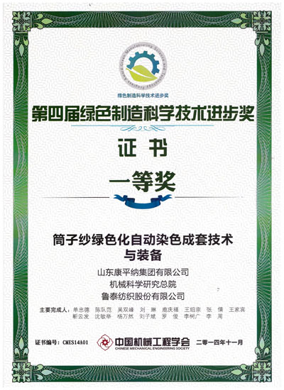 2014年中國機械工程學會年會于11月9日—10日在西安交通大學召開。山東康平納集團有限公司聯(lián)合機械科學研究總院、魯泰紡織股份有限公司申報的《筒子紗綠色化自動染色成套技術與裝備》榮獲第四屆中國綠色制造科技進步一等獎。會上,中國工程院周濟院長做了《中國制造—2025》的主題報告,分析了中國機械制造業(yè)發(fā)展前景與趨勢。在科技成果交流會上,集團總經理劉琳做了《筒子紗綠色化自動染色成套技術與裝備》專題報告,機械科學研究總院副院長單忠德做了《裝備工業(yè)綠色制造技術現(xiàn)狀及未來發(fā)展》專題報告,以筒子紗綠色化自動染色成套技術與裝備為例分析了裝備工業(yè)的發(fā)展趨勢。會議期間與會代表參觀了中國重型機械研究院股份有限公司的國家重點實驗室。